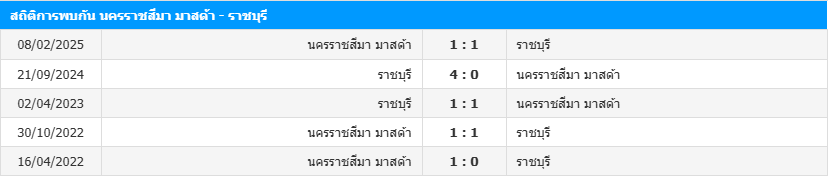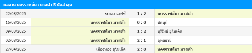 สถิติ 5 เกมหลังสุดของ นครราชสีมา มาสด้า