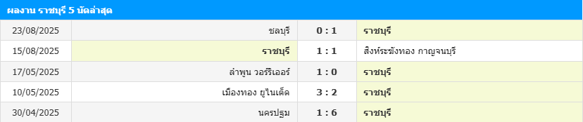 สถิติ 5 เกมหลังสุดของ ราชบุรี เอฟซี