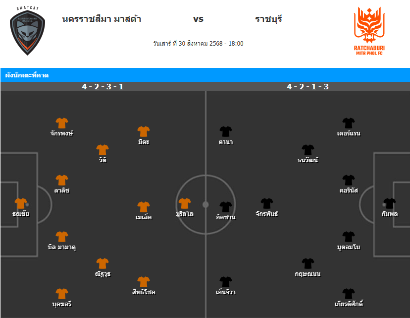 นครราชสีมา มาสด้า (4-2-3-1) ธณชัย หนูราช – บุคฆอรี เหล็มดี , บิล มามาดู, เนนาด ลาลิช, จักรพงษ์ แสนมะฮุง – ณัฐวุธ เจริญบุตร, วิติ มาร์ติเนซ – สิทธิโชค ภาโส , เดยาน เมเล็ค, ฮิโรทากะ มิตะ – เดนนิส มูริลโล