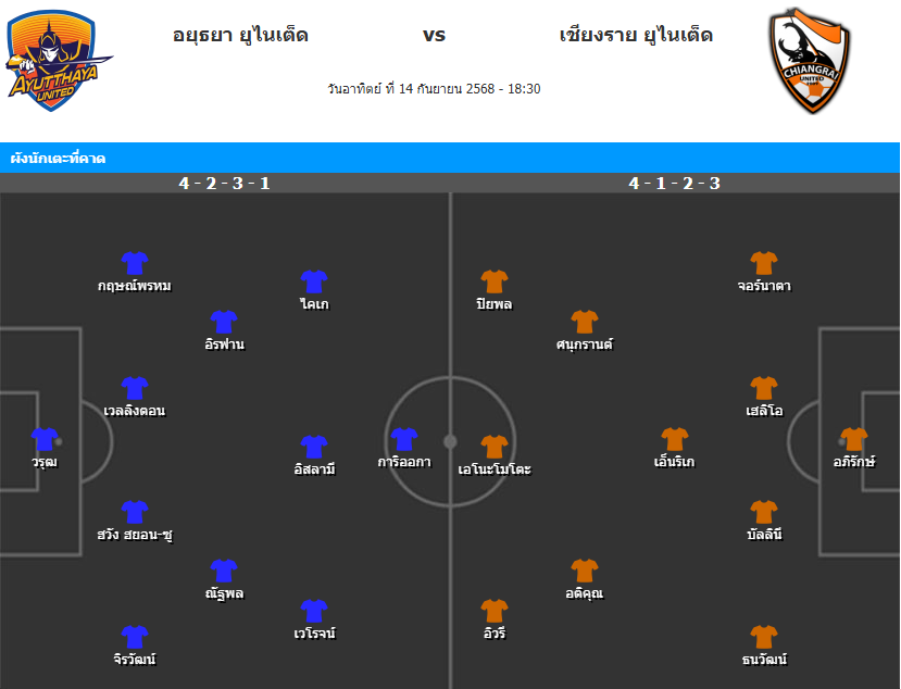 อยุธยา ยูไนเต็ด (4-2-3-1) วรุฒ เมฆมุสิก – จิรวัฒน์ จันทร์พงษ์, ฮวัง ฮยอน-ซู, เวลลิงตอน ปริออรี, กฤษณ์พรหม บุญสาร – ณัฐพล วรสุทธิ์, อิรฟาน ดอเลาะ – เวโรจน์ ป้อมบุบผา, ยาซีร์ อิสลามี, ไคเก เลมีส, ดิเอโก การิออกา