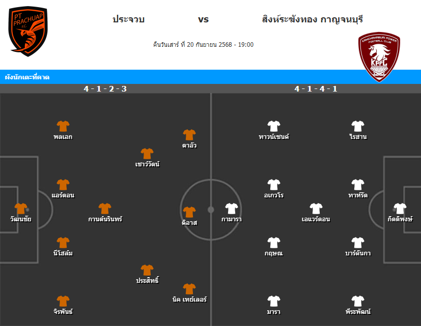 พีที ประจวบ เอฟซี (4-1-2-3) วัฒนชัย สระทองจันทร์ – จิรพันธ์ ผาสุขขันธ์, เยสเปอร์ นีโฮล์ม, แอร์ตอน, พลเอก มณีกร – กานต์นรินทร์ ถาวรศักดิ์ – ประสิทธิ์ จันทุม, เชาว์วัตน์ วีระชาติ – นิค เทย์เลอร์, โรดริโก ดิอาส, ตาอัว แฟร์เรรา