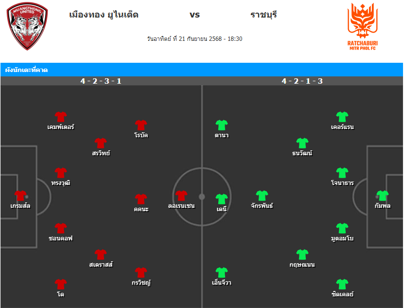 บทวิเคราะห์เกม : แมตช์นี้ถือเป็นเกมใหญ่ของสัปดาห์ เมืองทอง ได้เปรียบจากผลงานในบ้านที่แข็งแกร่งและยิงประตูได้ต่อเนื่อง ขณะที่ ราชบุรี แม้จะมีเกมรับที่เหนียวแน่น แต่ผลงานนอกบ้านยังไม่นิ่งพอ เมื่อเปรียบเทียบภาพรวมแล้ว เจ้าถิ่นดูมีความมั่นใจและความเฉียบคมมากกว่า คาดว่าเกมนี้จะสูสีในช่วงแรก แต่เมืองทองจะอาศัยจังหวะเกมรุกที่หลากหลายปิดเกมได้ในท้ายที่สุด