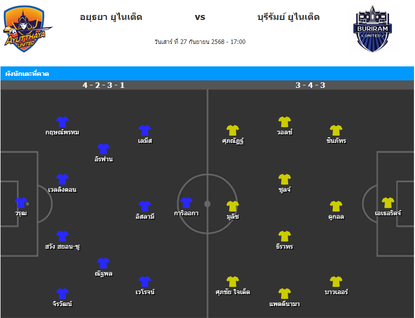 บทวิเคราะห์เกม : แม้ อยุธยา ยูไนเต็ด จะมีสถิติการเล่นในบ้านที่ค่อนข้างเหนียวแน่นและสามารถทำประตูได้ต่อเนื่อง แต่เมื่อเทียบกับมาตรฐานและความมั่นคงของ บุรีรัมย์ ยูไนเต็ด แล้วยังเป็นรองพอสมควร แนวรุกของทีมเยือนมีความหลากหลาย สามารถเจาะได้ทั้งจากจังหวะต่อบอลเร็วและลูกตั้งเตะ ขณะที่เจ้าบ้านน่าจะเลือกใช้แท็กติกตั้งรับลึกและรอโต้กลับด้วยความเร็ว แต่ด้วยความต่อเนื่องและความคมของบุรีรัมย์ คาดว่าจะครองเกมได้มากกว่า และมีโอกาสบุกมาเก็บสามแต้มกลับออกไป