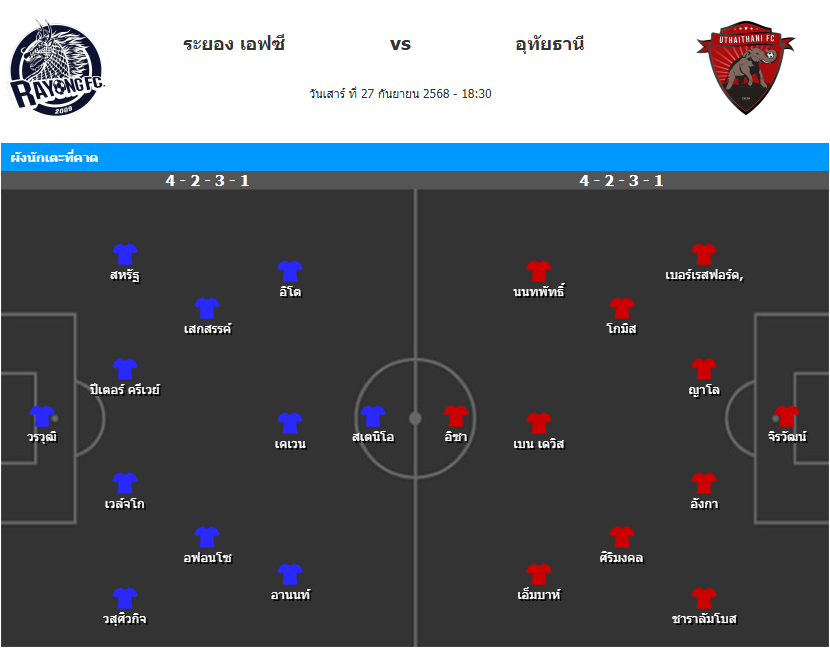 บทวิเคราะห์เกม : เมื่อเปรียบเทียบฟอร์มชัดเจนว่า ระยอง เอฟซี มีความได้เปรียบมากกว่า ทั้งจากการเล่นในบ้านและความมั่นใจที่ยังรักษาได้ต่อเนื่อง ขณะที่ อุทัยธานี เอฟซี ยังไม่อาจหาทางออกจากวิกฤติ โดยเฉพาะเกมรับที่เสียประตูง่ายและไร้ความมั่นใจ คาดว่าเจ้าถิ่นจะเดินหน้าเปิดเกมรุกตั้งแต่ต้น ขณะที่ทีมเยือนคงพยายามตั้งรับเต็มกำลัง แต่สุดท้ายด้วยคุณภาพการเข้าทำของระยอง น่าจะเพียงพอสำหรับการคว้าสามแต้ม