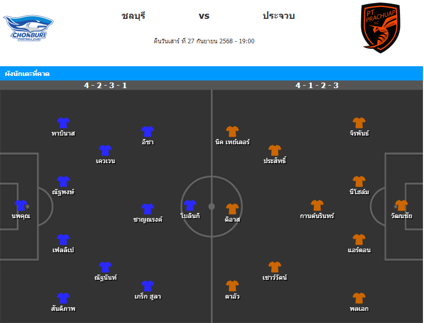 บทวิเคราะห์เกม : จากผลงานที่ผ่านมา ทั้งสองทีมถือว่าอยู่ในระดับใกล้เคียง แต่เมื่อมองเฉพาะเกมในบ้านและนอกบ้าน ชลบุรี เอฟซี มีความได้เปรียบมากกว่า พวกเขาสามารถเล่นเกมบุกได้มั่นใจเมื่อมีเสียงเชียร์หนุน ขณะที่ พีที ประจวบ เอฟซี ออกไปเยือนแล้วมักพลาดเสียประตูง่าย คาดว่ารูปเกมจะเริ่มต้นสูสี มีโอกาสกอดคอแบ่งแต้มกันไป