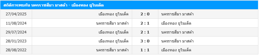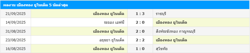 สถิติ 5 เกมหลังสุดของ เมืองทอง ยูไนเต็ด