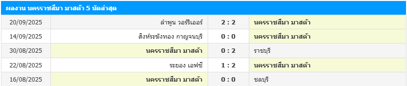 สถิติ 5 เกมหลังสุดของ นครราชสีมา มาสด้า เอฟซี