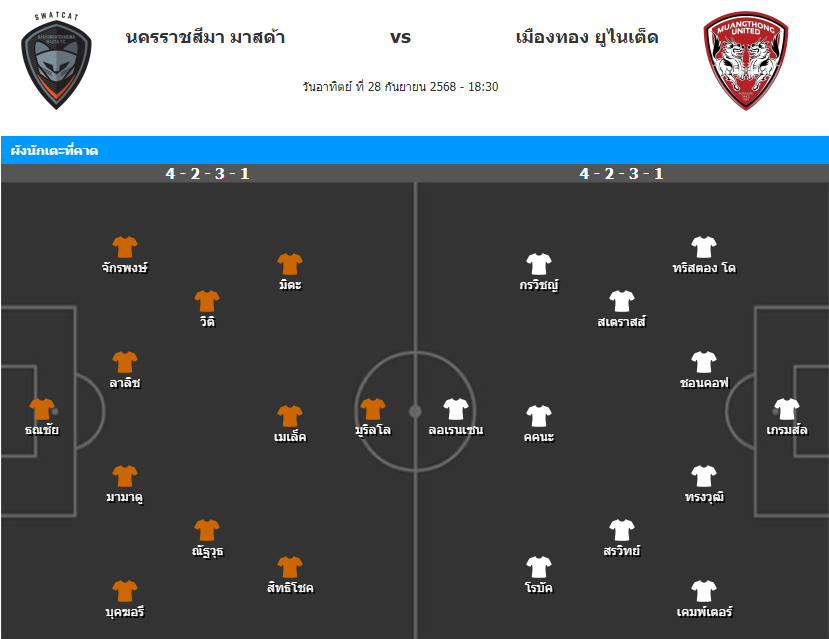 บทวิเคราะห์เกม : เกมนี้แม้ นครราชสีมา มาสด้า เอฟซี จะได้เล่นในบ้าน แต่ฟอร์มโดยรวมยังไม่มั่นคงและเสียประตูค่อนข้างง่าย ขณะที่เมืองทอง ยูไนเต็ด ดูมีเกมรุกที่เฉียบคมและมีโอกาสจบสกอร์มากกว่า เชื่อว่าช่วงครึ่งหลังเมืองทองจะใช้ความเหนือกว่าทั้งแท็กติกและศักยภาพผู้เล่นค่อย ๆ กดดันเจ้าถิ่นจนได้ประตูสำคัญ ทำให้มีโอกาสคว้า 3 แต้มกลับออกไปได้