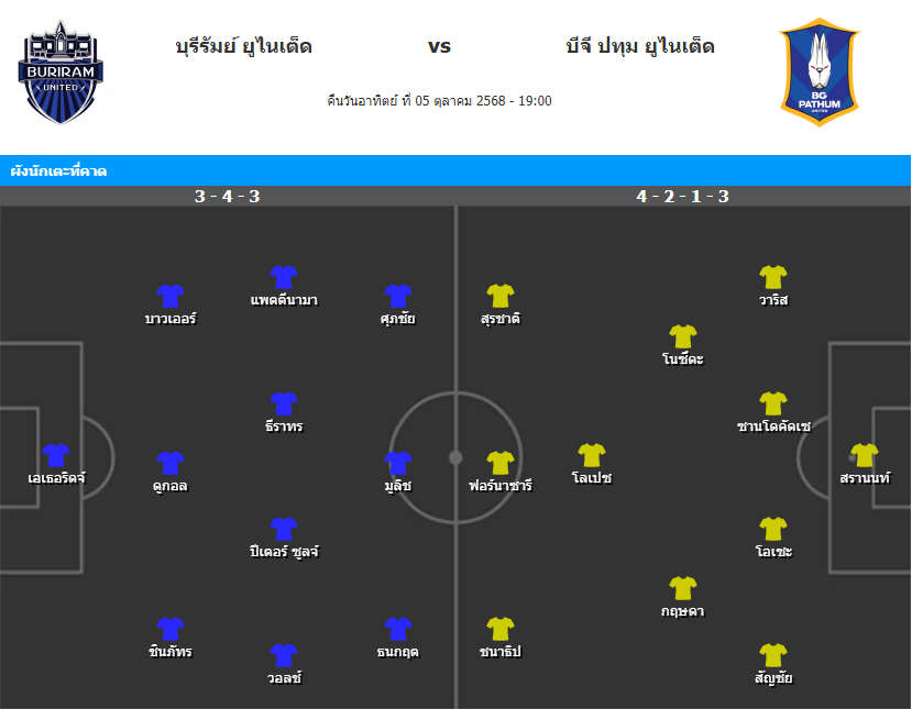 บทวิเคราะห์เกม : จากสถิติที่ผ่านมาและฟอร์มปัจจุบัน บุรีรัมย์ ยูไนเต็ด มีภาษีดีกว่าชัดเจน การเล่นในบ้านยังแข็งแกร่งและมีตัวรุกที่พร้อมปิดบัญชีทุกโอกาส ขณะที่บีจีแม้มีคุณภาพ แต่ความผิดพลาดยังคงให้เห็น เกมนี้จึงคาดว่าเจ้าบ้านน่าจะเดินหน้าบดชนะได้ตามมาตรฐาน