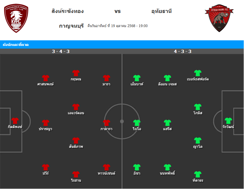 อุทัยธานี เอฟซี (4-3-3) จิรวัฒน์ วังทะพันธ์ – เจมส์ เบอร์เรสฟอร์ด, คริสติยอง โกมิส, มาร์เซโล ญาโล, ทิตาธร อักษรศรี – ลีออน เจมส์, แฮรีส สจ๊วร์ต, นนทพัทธิ์ นาคสวัสดิ์ – ชิโกซี เอ็มบาห์, บรูโน ไบโอ, โมฮาเหม็ด อิซา