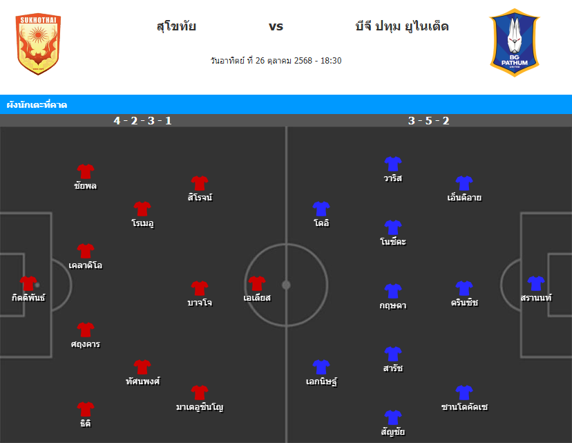 บทวิเคราะห์เกม : แม้สุโขทัยจะเล่นในบ้าน แต่บีจี ปทุม ยังดูเหนือกว่าในด้านความเด็ดขาดและการเล่นเป็นทีม สถิติพบกัน 5 นัดหลัง บีจี ชนะ 3 เสมอ 1 แพ้ 1 แสดงให้เห็นถึงความเป็นต่อ เกมนี้คาดว่าเจ้าบ้านจะเน้นรับเหนียวแต่ต้านไม่อยู่ในช่วงท้ายเกม