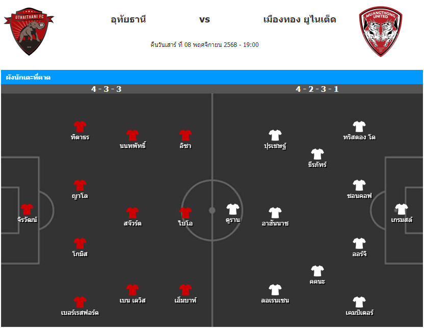 บทวิเคราะห์เกม : เจ้าถิ่นเด่นเรื่องพลังการเล่นในบ้าน ส่วนทีมเยือนมีประสบการณ์และคุณภาพนักเตะเหนือกว่า หากวัดจากฟอร์มปัจจุบัน เมืองทองแม้ฟอร์มยังไม่นิ่งแต่มีแนวโน้มบุกคุมเกมได้มากกว่า ขณะที่อุทัยธานียังต้องพึ่งจังหวะสวนกลับและลูกนิ่งเป็นหลัก
