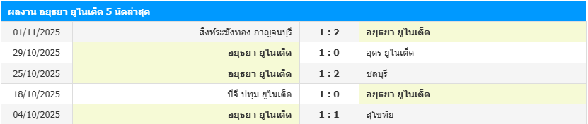 สถิติ 5 เกมหลังสุดของ อยุธยา ยูไนเต็ด