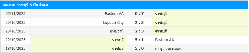 สถิติ 5 เกมหลังสุดของ ราชบุรี เอฟซี