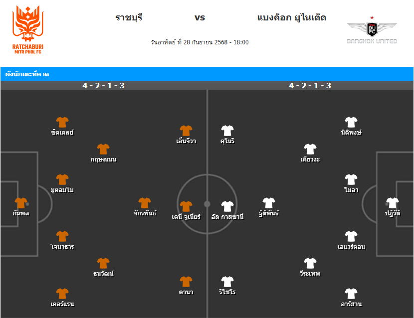 บทวิเคราะห์เกม : ทั้งสองทีมต่างมีผลงานที่สม่ำเสมอ โดยราชบุรี เอฟซี แข็งแกร่งในบ้าน ขณะที่แบงค็อก ยูไนเต็ด ก็ทำได้ดีเยือน ฟอร์มล่าสุดเกือบไม่ต่างกันมากนัก จึงทำให้เกมนี้มีแนวโน้มสูสีและเต็มไปด้วยการต่อสู้ที่เข้มข้น แม้สถิติที่ผ่านมาจะเป็นฝั่งแบงค็อกที่เหนือกว่า แต่ราชบุรียังมีจุดแข็งคือเกมในบ้านที่มักเล่นได้มั่นใจ เชื่อว่าผลการแข่งขันมีโอกาสออกมาแบบแบ่งแต้มสูง